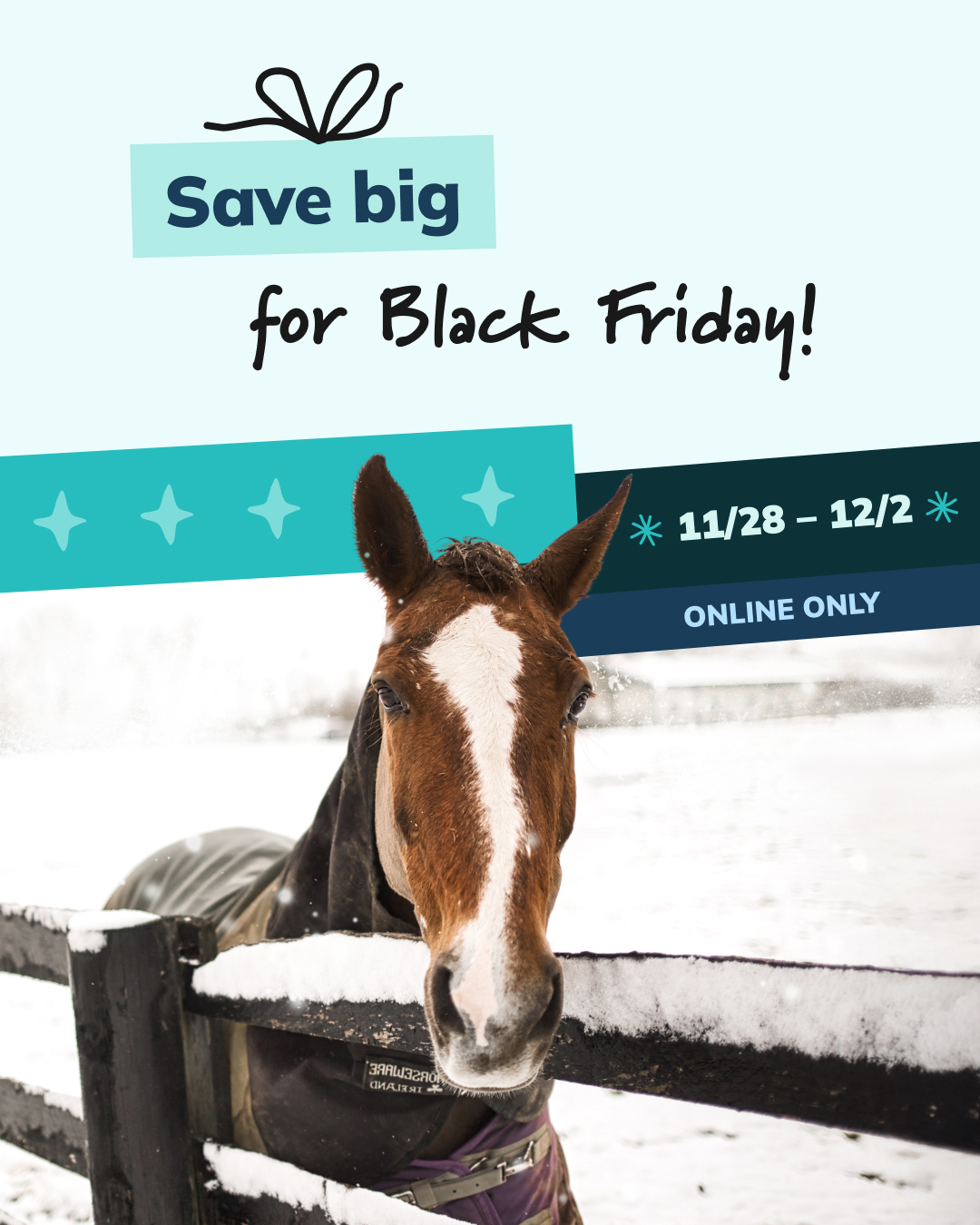 Friday, November 28th to Tuesday, December 2nd: Black Friday, Small Business Saturday, and Cyber Monday are all coming to your online store. Throughout the weekend, your clients will enjoy an exclusive sitewide coupon they can stack with existing rebates for extra savings on their horse’s wellness essentials. Those who have opted in for text communications will also get an SMS message supporting this event.